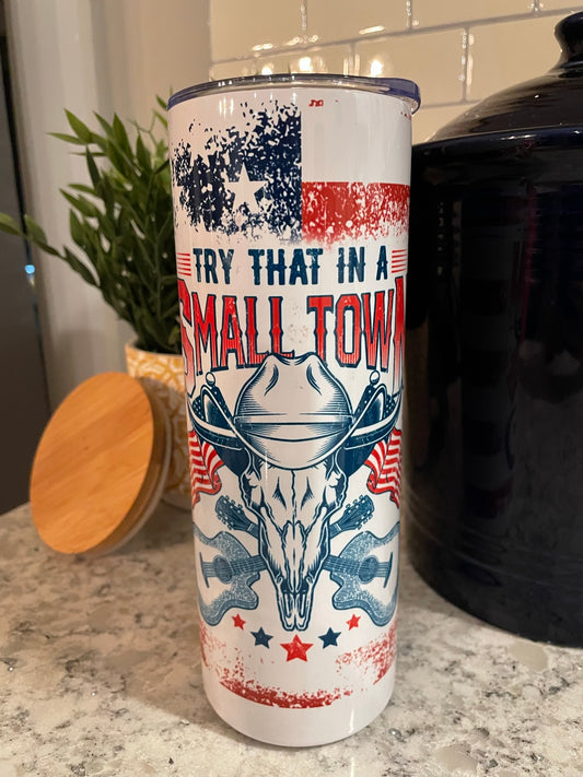 20 ounce Insulated Skinny Tumbler - Try That In A Small Town - Jason Aldean - White Background