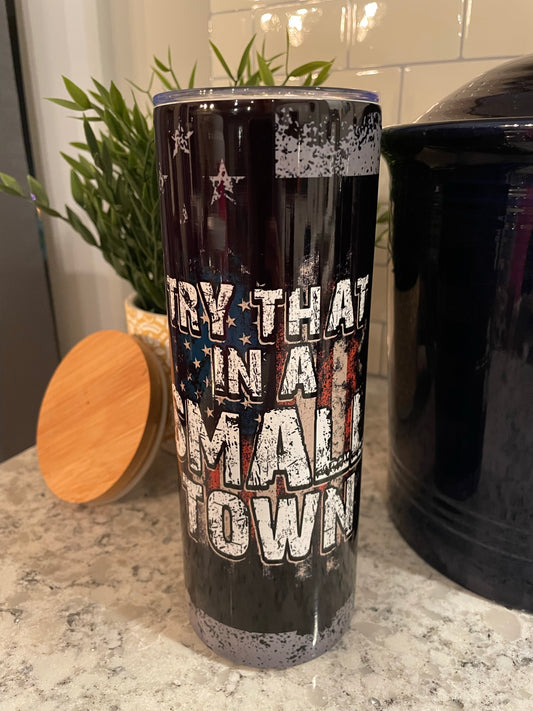 20 ounce Insulated Skinny Tumbler - Try That In A Small Town - Jason Aldean - Black Background