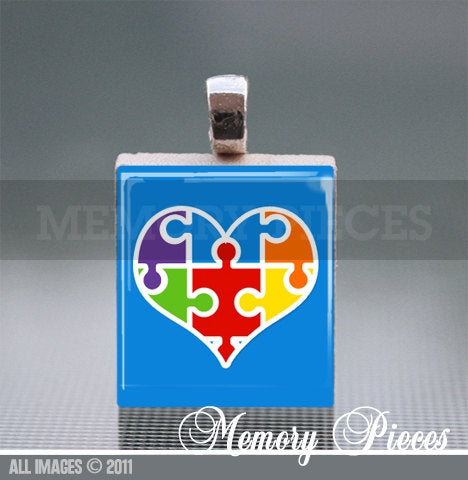 Autism Awareness Heart 'Puzzle Pieces' Scrabble Tile Pendant with Silver Ball Chain