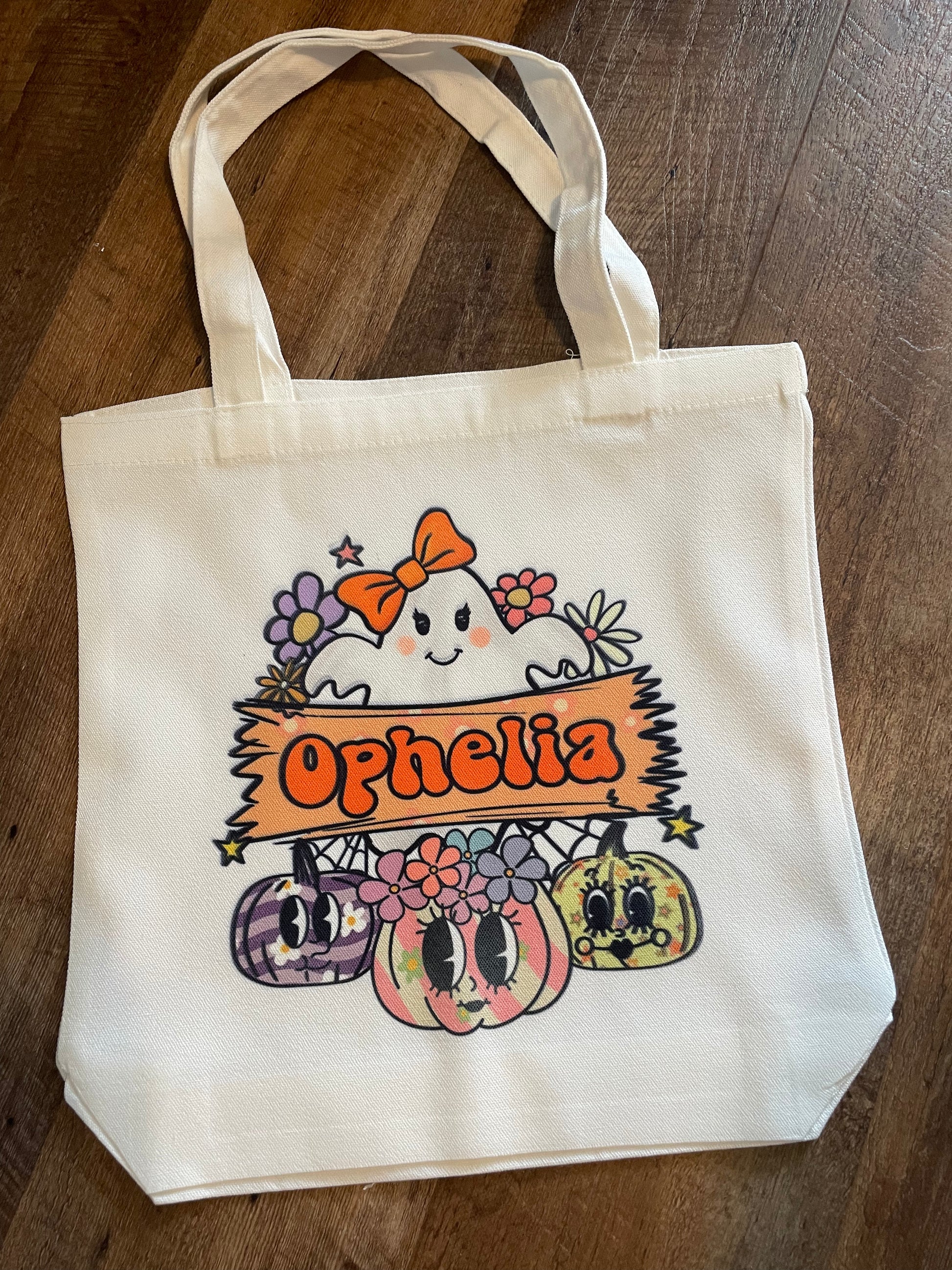 Now your little gobblin' can have their name printed on our tote bags! This saves a fight later as to who's bag is who's!