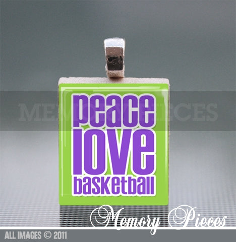 'Peace Love Basketball' Scrabble Tile Pendant with Ball Chain